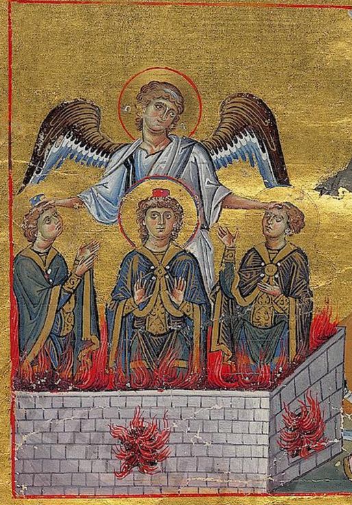 «Вижу четырех мужей несвязанных, ходящих среди огня, вид четвертого подобен сыну Божию» (Дан. 3:92). В традиционном библейском понятии «сын Божий» – это ангел. Рисунок из Минология Василия II, византийский манускрипт XI века. Библиотека Ватикана.