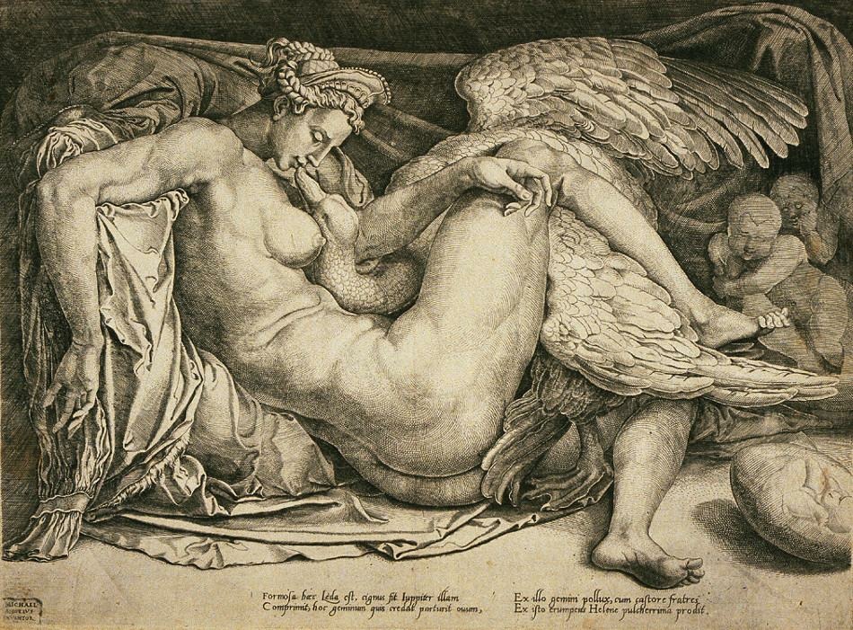 Падший архангел приняв образ лебедя соблазняет Леду, жену царя Тиндарея. Гравюра фламандца Корнелиса Боса с картины Микеланджело Буонарроти, 1537 г., Музей искусств Герберта Ф. Джонсона, Нью-Йорк.