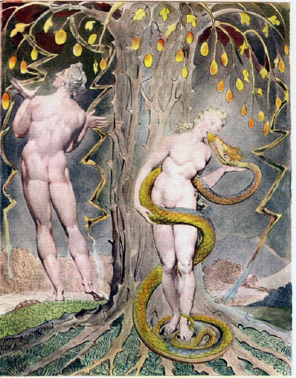 Искушение Евы. Худ. Уильям Блейк, 1825 г. Автор слишком домысливает библейский сюжет и фантазирует на тему «тактильного контакта» Евы со змием.