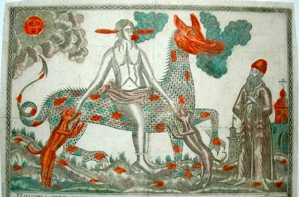 Дева на огненном змее. Лубочная картинка из «Зерцала» – «притча вельми страшна и ужасна всякому христианину». Оттиск первой половины 1760 г.