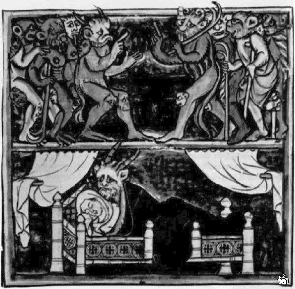 Совещание демонов и зачатие Мерлина. Миниатюра 1290 года. Иллюстрация к роману Робера де Борона «Мерлин». Мерлин – легендарный маг, чародей и советник короля Артура был зачат девушкой монахиней, соблазненной ночным демоном.
