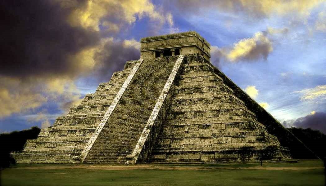 Рис. 11: Пирамида и расположенный на ее вершине храм языческого бога Кетцалькоатля (пернатого змея-дракона) в городе Чичен-Ица на юге Мексики. В храме, расположенном на вершине пирамиды, совершались ежемесячно сотни человеческих жертвоприношений