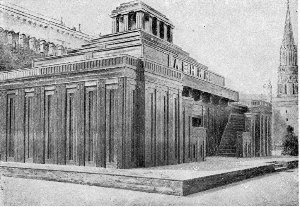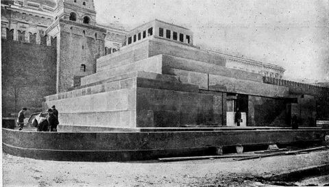 В 1924-1930-х годах на Красной площади в Москве большевики строят последовательно три варианта мавзолея, каждый следующий — больше и сложнее по форме предыдущего. Интересно, что во время похорон Ленина в январе 1924 года, когда на Красной площади был построен временный деревянный мавзолей наиболее простой формы, на нарукавных повязках участников похоронной комиссии был схематически изображен мавзолей семиступенчатой формы. То есть, работа над проектом шла еще до смерти Ленина.