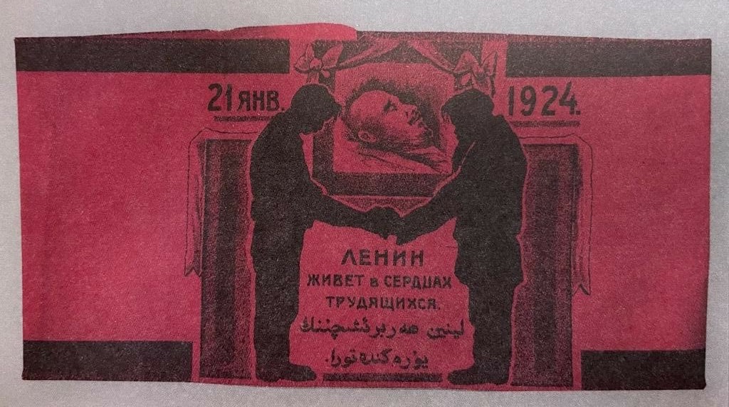 Рис. 15 и Рис. 16: Траурные нарукавные повязки членов похоронной комиссии Ленина в январе 1924. На верхней повязке изображен Мавзолей 2 и 3 проекта, а не первого. То есть уже к моменту смерти Ленина был сделан эскизный проект второго мавзолея, который начал строиться лишь через четыре месяца после смерти Ленина. На нижней повязке надпись символично повторена на уйгурском языке – языке Империи Чингисхана, на котором писали в XII-XV веках властители Орды, покорившие Русь