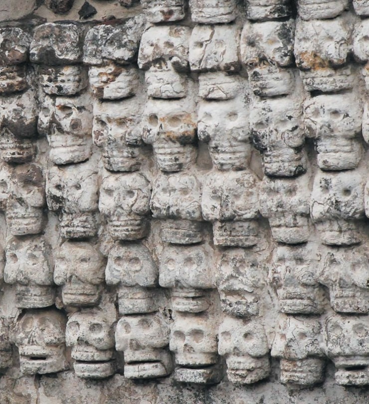 Рис. 6: Ряд камней чередуются с рядами черепов возле входа в храм ацтеков Кецалькоатль (пернатого змея) в Теночтитлане в Мексике