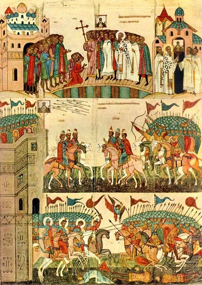 «Во-первых, войском руководил не сам святой князь, а его сын - Мстислав, и сам князь в том походе не участвовал, - объясняет кандидат исторических наук, иерей Василий Секачев. - Во-вторых, Андрей Боголюбский (канонизирован в 1751 году) почитается в лике святых за свою мученическую кончину как страстотерпец, погибший от рук изменников. Тверская летопись сообщает, что в 1174 году князь Андрей был убит по наущению его жены, участвовавшей в заговоре. Толпа убийц, двадцать человек, пробралась к дворцу, перебила малочисленную охрану, вломилась в опочивальню безоружного князя и изрубила его мечами и саблями. В чине страстотерпцев могут быть канонизированы люди, по-христиански претерпевшие мучительную насильственную смерть, но необязательно бывшие святой праведной жизни, потому что решающим в жизни христианина является именно его кончина. А в жизни князя действительно были непримиримые противоречия: с одной стороны, он был боголюбив, за что его и прозвали Боголюбским - привез Владимирскую икону из Вышгорода во Владимир, установил некоторые церковные праздники (например, именно он установил празднование Покрова Богородицы - 14 октября по н. с. - и Изнесения древа Честнаго и Животворящего Креста - 14 августа по н. с.), построил прекрасные храмы - Успенский Собор во Владимире, храм Покрова на Нерли (первый храм Покрова Богородицы). Но, с другой стороны, он был вовлечен в междоусобицы того времени и здесь, к сожалению, часто давал волю своему гневу. Проявления его ярости были страшны: попытка разорения Новгорода (изображенная на рассматриваемой иконе), разорение Киева в 1169 году. Князь хотел, чтобы Русь объединилась, чтобы не было распрей, и эта его идея была правильной. Однако он добивался этого насильственными методами. Может быть, Господь и послал ему такую страшную кончину, дав возможность пострадать, чтобы все доброе в личности князя восторжествовало, а темное отступило».