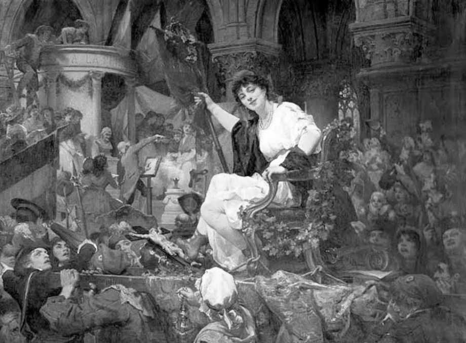Далее, Парижской коммуной было принято постановление: «все существующие в Париже церкви или храмы всех религий немедленно закрываются, всякий, кто потребует их открытия будет арестован как подозрительный»[7]. 7 ноября (!) было принято решение о проведении в Соборе Парижской Богоматери специального празднества посвященному культу Богини Разума. Этот «Разум», хотя скорее отсутствие такового, должна была символизировать некая оперная актриса, наряженная в весьма откровенные одежды.