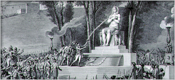 Один из элементов этого культа в подробностях описан очевидцами тех событий: «Среди развалин Бастилии возвышается колоссальная статуя «Природы» с надписью на ее основании: «Все мы дети ее». Из сосков ее грудей, которые она сжимает руками, льются в бассейн две струи воды. После речи во славу «Природы» президент Конвента подставляет чашу и совершает их нее возлияния вокруг и, затем выпив воду, передает чашу по очереди комиссарам, каждый из которых пьет воду под пушечный выстрел. Это акт братства и единения. Шествия открывают народные общества, над рядами которых реют знамена с изображением «всевидящего ока» [невольно вспоминается «Око Саурона» – м. М.], взор которого пронизывает густое облако»[10].