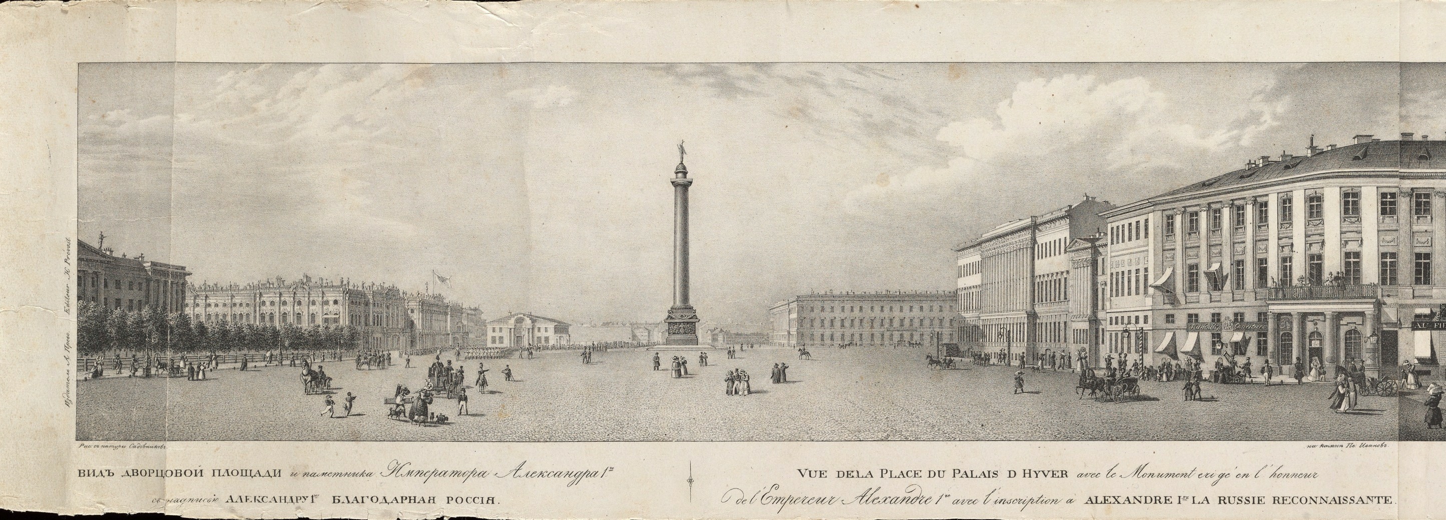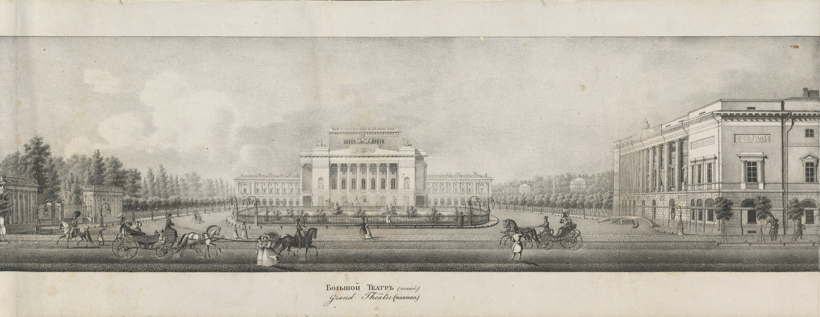 Большой театр. Фрагмент панорамы правой, теневой стороны Невского проспекта. Литографии И.А. и П.С. Ивановых по акварелям В.С. Садовникова. Изданы А.М. Прево. 1830