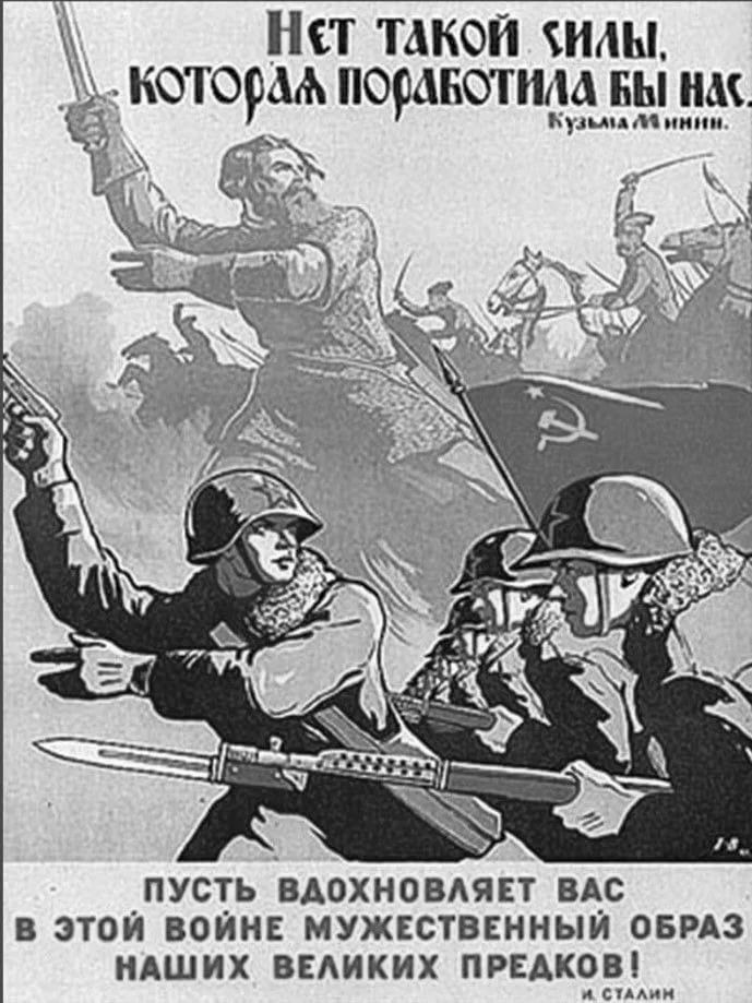 Надо честно признать, что речь Сталина перед войсками на Красной площади на параде 7 ноября 1941 года по меркам «верных ленинцев» была контрреволюционной. Такими словами со времен революции 1917 года никто к народу не обращался и таких имен не произносил: «Великая освободительная миссия выпала на вашу долю. Будьте же достойными этой миссии! Война, которую вы ведёте, есть война освободительная, война справедливая. Пусть вдохновляет вас в этой войне мужественный образ наших великих предков – Александра Невского, Димитрия Донского, Кузьмы Минина, Димитрия Пожарского, Александра Суворова, Михаила Кутузова!»[16].