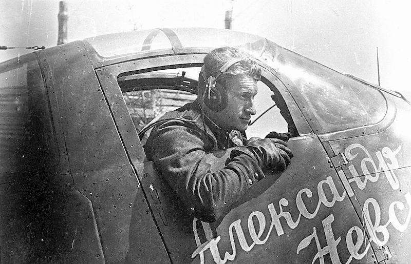 Герой Советского союза гвардии капитан Александр Билюкин в кабине истребителя «Александр Невский». 1944 год.