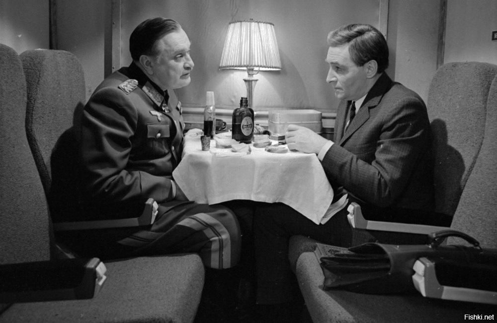 Сцена диалога Штирлица с генералом Вермахта в купе поезда. Кадр из фильма «Семнадцать мгновений весны», 1973 год.