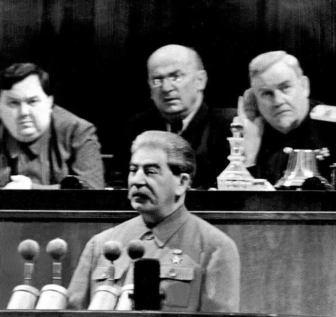 Сталин на XIX съезде КПСС, октябрь 1952 года. «Говорил он от начала до конца сурово, без юмора, никаких листков или бумажек перед ним на кафедре не лежало, и во время своей речи он внимательно, цепко и как-то тяжело вглядывался в зал, так, словно пытался проникнуть в то, что думают эти люди, сидящие перед ним и сзади...» (Писатель К. Симонов, участник Пленума ЦК партии).