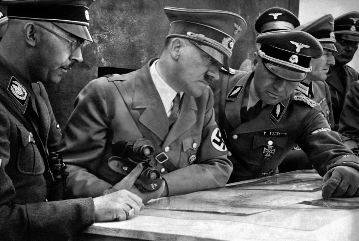 Адольф Гитлер и его «верные эсэсовцы» – рейхсфюрер СС Г. Гиммлер и генерал войск СС Й. Дитрих, 1941 год.