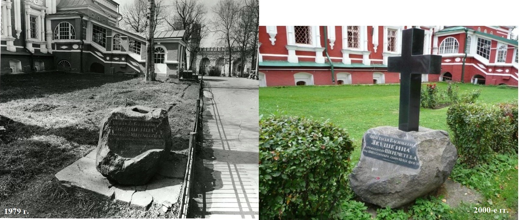 Фото 3. Памятник А.В.Якушкиной без креста в 1979 г. И с восстановленным крестом в 2000-х.