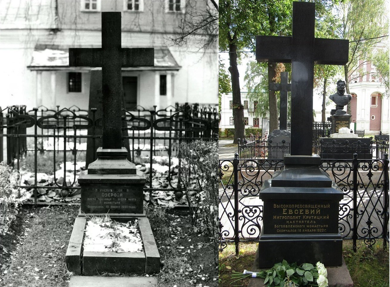 Археологи отмечают, что нынешний пространственно-архитектурный облик мемориального кладбища Новодевичьего монастыря с имеющимися надгробиями сформировался в 1950-х годах. А в конце 1930-х был большей частью поляной с остатками камней. Наверное, одними из первых после 1955 года были восстановлены два красивых черных гранитных креста по инициативе Святейшего Патриарха Алексия (Симанского). Это памятники на могиле митрополита Крутицкого Евсевия (Никольского) (+1922 г.) и игумении Новодевичьего монастыря Леониды (Озеровой) (+1920 г.).