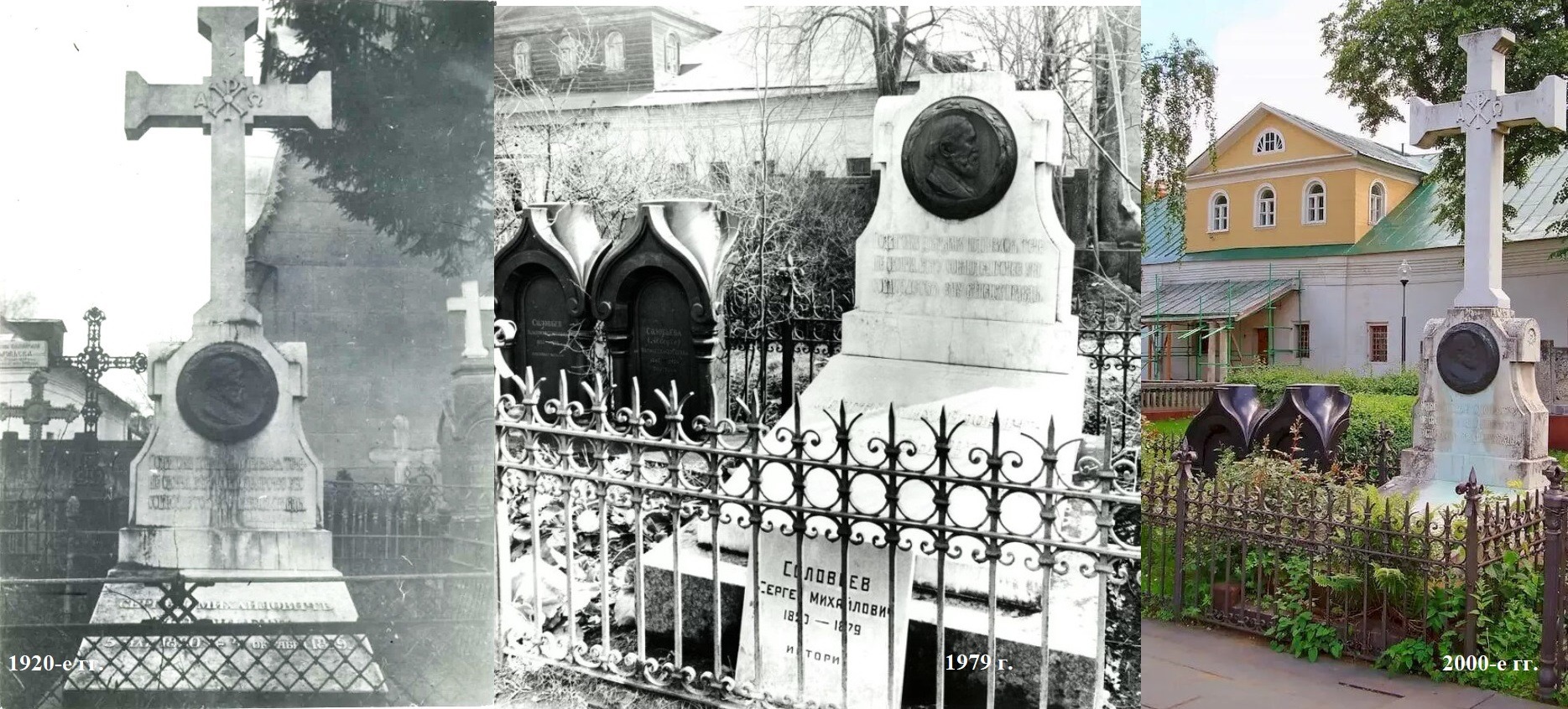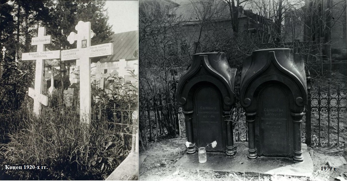 Судя по всему, тогда же в 1950-х были установлены два странных и одинаковых черных гранитных памятника на могиле философа Владимира Соловьева и его сестры поэтессы Поликсены Сергеевны. Они стоят так тесно, что поместить сверху даже небольшие кресты невозможно. Но есть старые фото этой могилы 1920-х годов, которые свидетельствуют, что изначально особого памятника у Соловьевых не было, стояли там два простых высоких деревянных креста. Существенно то, что на них начертано три имени Соловьевых: Владимир Сергеевич (+1900), Поликсена Владимировна (+1909) и Поликсена Сергеевна (+1924). Получается, что на этом месте рядом с историком Сергеем Михайловичем Соловьевым погребены не только его сын-философ и дочь, но прежде всего супруга. Поликсена Владимировна Соловьева, урожденная Романова. Она не удостоилась ни отдельного памятника, ни креста. Хотя всем известно, что без нее не было бы ни многотомной «Истории России с древнейших времен», ни одаренных детей, воспитанием которых она занималась.