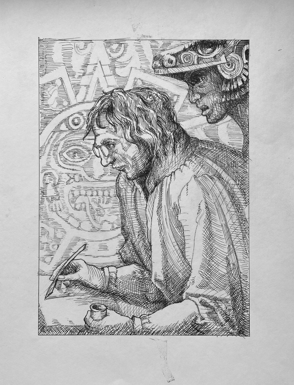 Но сейчас, бросая порою быстрые взгляды на дремлющую в углу комнаты громаду, облачённую в коричневую шерстяную рясу, наши рисовальщики исполнялись спокойствия, и дух их был мирен…