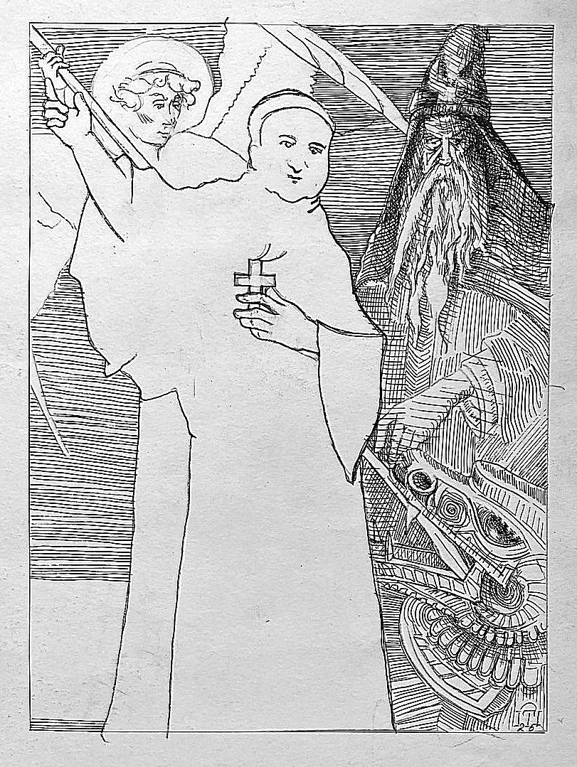 Отец Петрус, соорудив по окружности некий небольшой вал из вынутой земли, уложил мелкие сухие ветви и стал набрасывать сухую листву. Закончив приготовление кострища, он устроил небольшой костерок и подвесил на треноге котелок, наполненный той водой, которая была у них в запасе. Свежей водой, принесённой Клотцем, наполнил большой кувшин, стоящий в повозке. Затем подошёл к дереву, стоящему напротив священного дуба, воткнул лопату и прилёг полюбоваться поблёскивающим на лучах заходящего солнца медным Распятием. Крестом, утверждённым на языческом идоле.