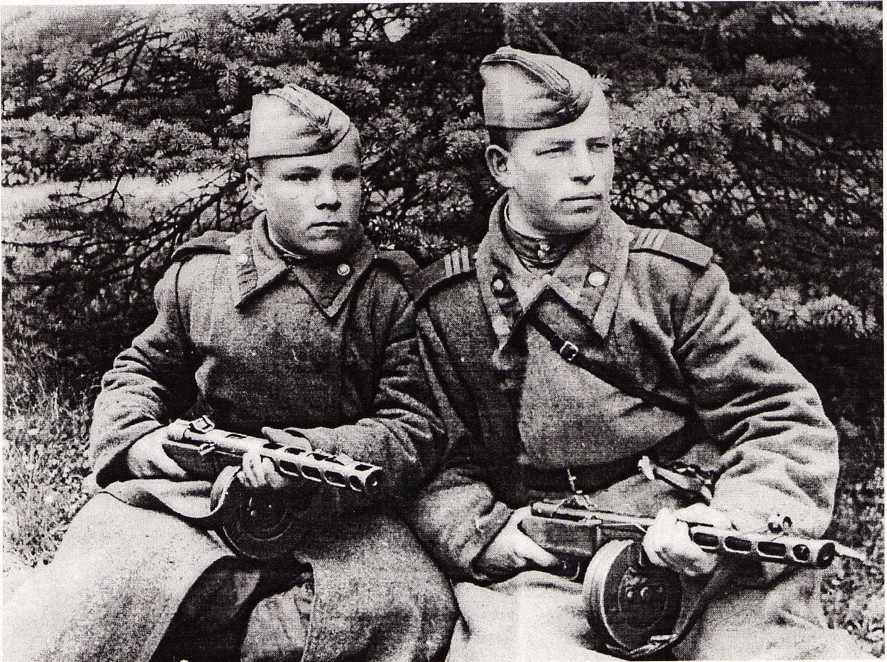 Вторую реликвию мне прислал кто-то из моих адресантов, зная о том, что я собираю и издаю песни русского воинства. Это – целое собрание военных песен и стихов, двадцатипятистраничная распечатка. Причём, это были тексты как широкоизвестных песен на стихи М. Исаковского, А. Фатьянова, Я. Шведова, Л. Ошанина, Е. Долматовского и других поэтов, стихи А. Твардовского, так и малоизвестные песни. А также – стихи, как видно, публиковавшиеся в дивизионных и армейских газетах. Таким старательным собирателем оказался сержант Михаил Ефимович Гундоров. Прислали мне и фотографию, на которой он вместе с боевым товарищем. Молодые победители мая 1945 года в Берлине.
