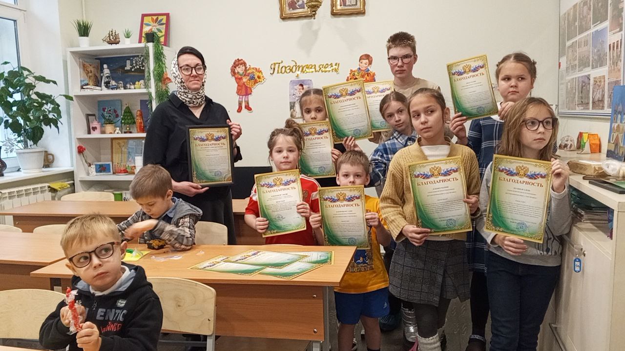 Руководитель изостудии «Рябинка» Ольга Корельская с авторами коллажей. Гатчина