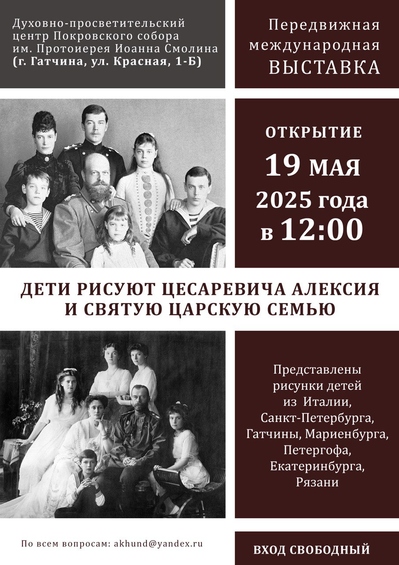 19 мая 2025 года, в день памяти святого праведного Иова Многострадального – Небесного покровителя святого Императора Николая II – исполнится 157 лет со дня рождения Царя-мученика. В 12.00 по благословению епископа Гатчинского и Лужского Митрофана в Духовно-просветительском центре Покровского собора им. Протоиерея Иоанна Смолина (г. Гатчина, ул. Красная, 1-Б) в рамках программы «Чтобы Россия оставалась Россией», начатой 5 лет назад Союзом Русских землячеств Санкт-Петербурга и Ленинградской области, откроется передвижная международная выставка «Дети рисуют Цесаревича Алексия и святую Царскую семью».