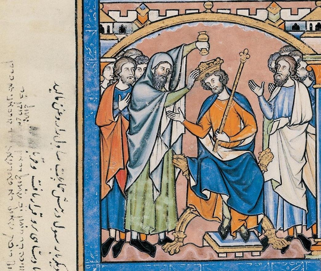 Второе — уже публичное Помазание Самуилом Царя Саула на Царство Изральское: И сказал Самуил народу: пойдем в Галгал, и обновим там царство И пошел весь народ в Галгал, и поставили там Саула царем пред Господом в Галгале (1. Цар. 11: 14-15). Миниатюра из Библии французского Царя Людовика IX Святого. Создана в 1240–1250 годы.