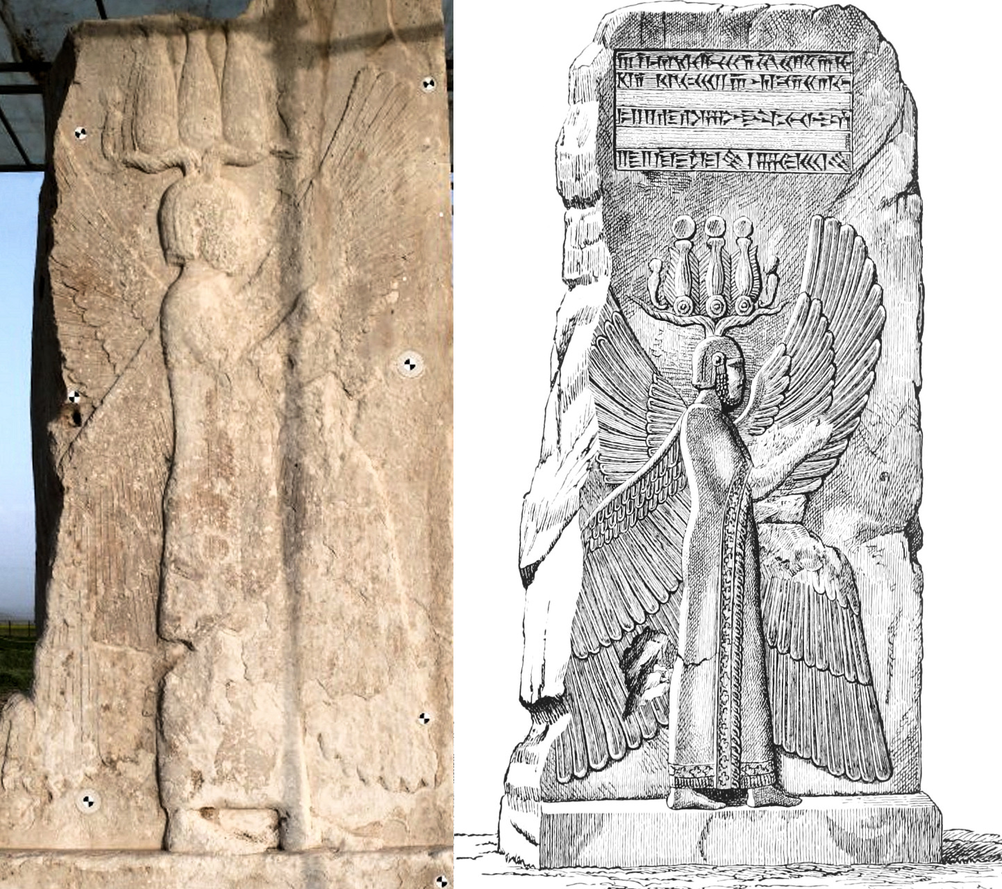 Многокрылый Царственный Ангел-Хранитель, подобный Херувиму, олицетворяющий Царя Кира II Великого на столбе врат в Пасаргаде. На вершине стелы ещё в XIX веке была клинописная надпись на трех языках: «Я Кир, Царь, Ахеменец». Обращает на себя внимание загадочная Царская Корона, возможно, изображающая три сосуда со Священным Мvром