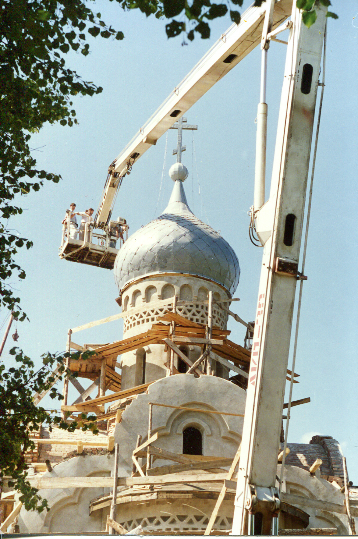 В это время мы занимались крышей. Сам четверик крыли чёрным металлом – на оцинковку средств не хватило. А красили металл «космической» краской. Пожертвовали нам эту краску из ракетной части. Отдавая, сказали: