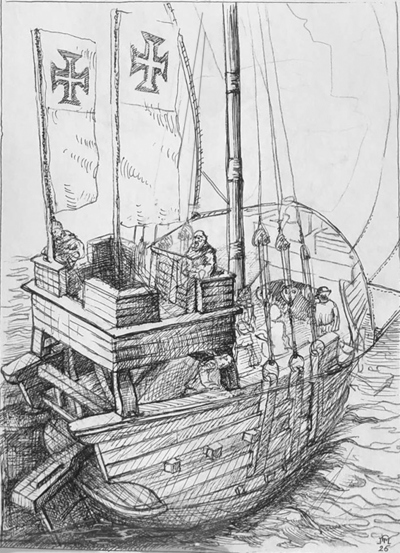 Сейчас вся команда когга – вместе с пассажирами – составляла всего четырнадцать человек: епископ, поэт, его спутник, двое рыцарей, оруженосец, двое студентов, трактирщик, воин Болеслав, прикомандированный сержантом с Заставы, присоединились к четырём морякам, приведшим это небольшое одномачтовое судно по реке.