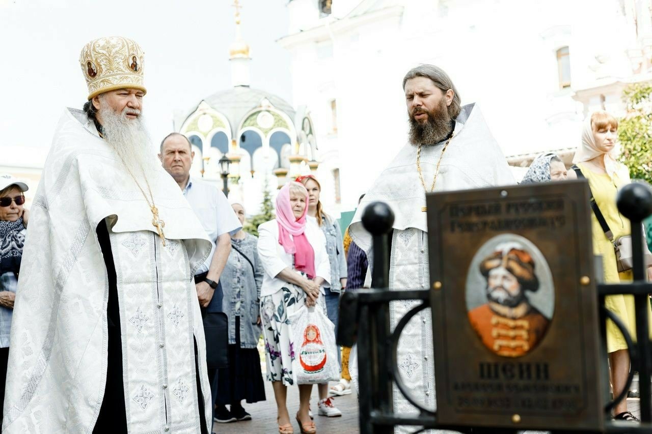 Насельник Свято-Троицкой Сергиевой лавры архимандрит Евстафий, священник Александр Морозов, потомки рода Шеиных и члены Спасской общины на панихиде у могилы генералиссимуса А.С. Шеина. 2023 г.