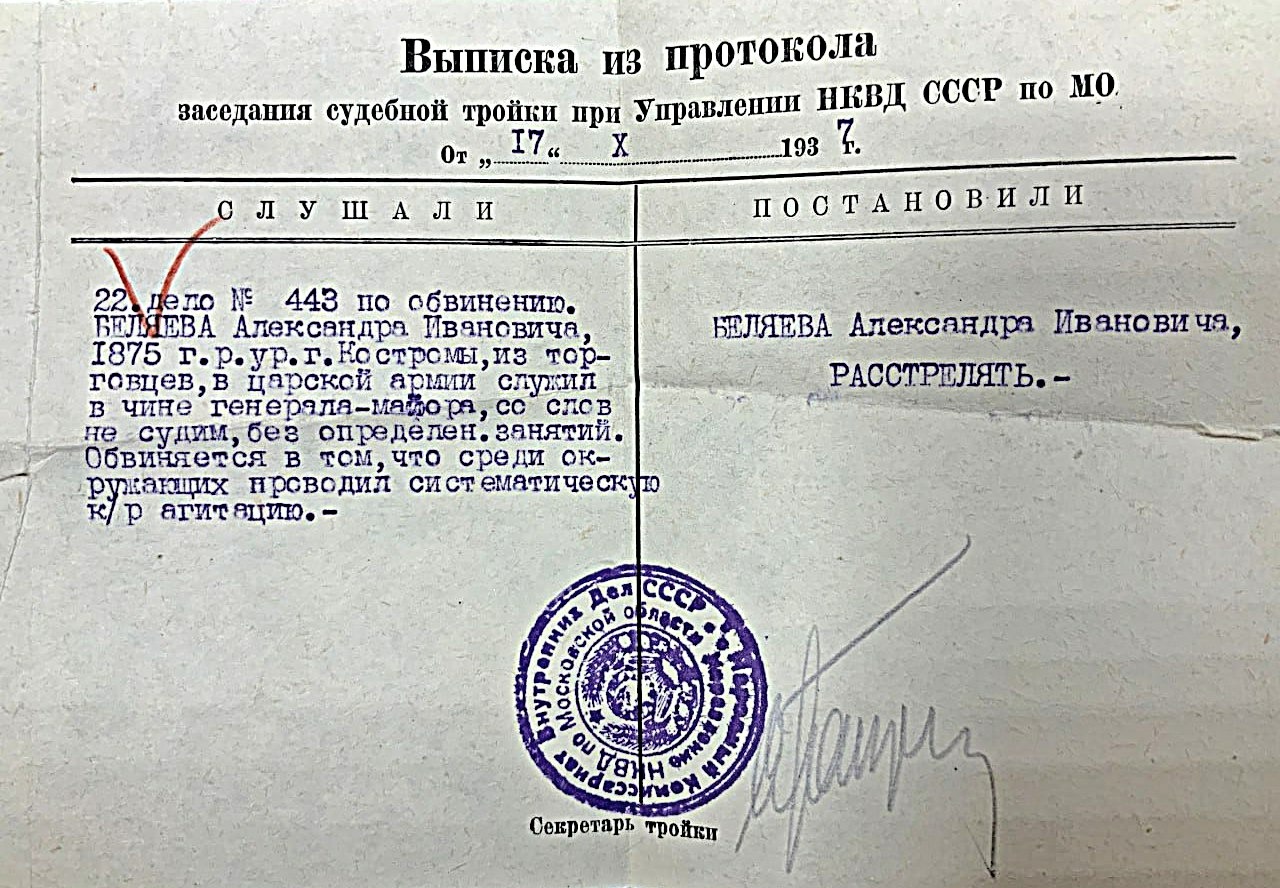 В 1937 г., 17 августа, Александр Иванович Беляев, к тому времени пенсионер, инвалид, был арестован органами НКВД по обвинению в контрреволюционной фашистской агитации и враждебности к советской власти.