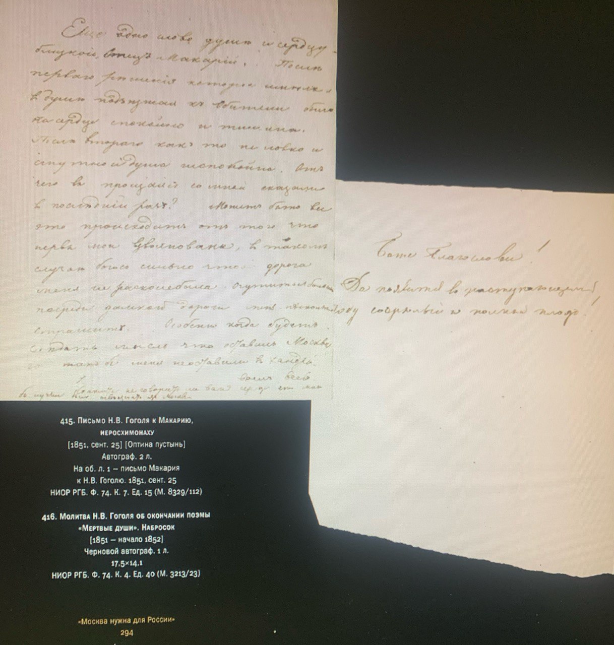 Гоголь был едва ли не единственным русским светским писателем, творческую мысль которого могли питать святоотеческие творения. В один из приездов в Оптину (возможно, и в первый) он прочитал рукописную книгу – на церковнославянском языке – преподобного Исаака Сирина (с которой в 1854 году старцем Макарием было подготовлено печатное издание), ставшую для него откровением. В монастырской библиотеке хранился экземпляр первого издания «Мертвых душ», принадлежавший графу Толстому, а после его смерти переданный отцу Клименту (Зедергольму), с пометами Гоголя, сделанными по прочтении этой книги. На полях одиннадцатой главы, против того места, где речь идет о «прирожденных страстях», он набросал карандашом: «Это я писал в "прелести" (обольщении. – В. В.), это вздор – прирожденные страсти – зло, и все усилия разумной воли человека должны быть устремлены для искоренения их. Только дымное надмение человеческой гордости могло внушить мне мысль о высоком значении прирожденных страстей – теперь, когда стал я умнее, глубоко сожалею о «гнилых словах», здесь написанных. Мне чуялось, когда я печатал эту главу, что я путаюсь, вопрос о значении прирожденных страстей много и долго занимал меня и тормозил продолжение "Мертвых душ". Жалею, что поздно узнал книгу Исаака Сирина, великого душеведца и прозорливого инока. Здравую психологию и не кривое, а прямое понимание души, встречаем у подвижников-отшельников. То, что говорят о душе запутавшиеся в хитросплетенной немецкой диалектике молодые люди, – не более как призрачный обман. Человеку, сидящему по уши в житейской тине, не дано понимания природы души».