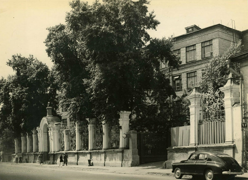 Илл. 10. Сохранившийся арочный фрагмент и барочный столб ограды XVIII века храма Спаса Преображения на Б. Спасской ул., 15. 1960-ые годы.