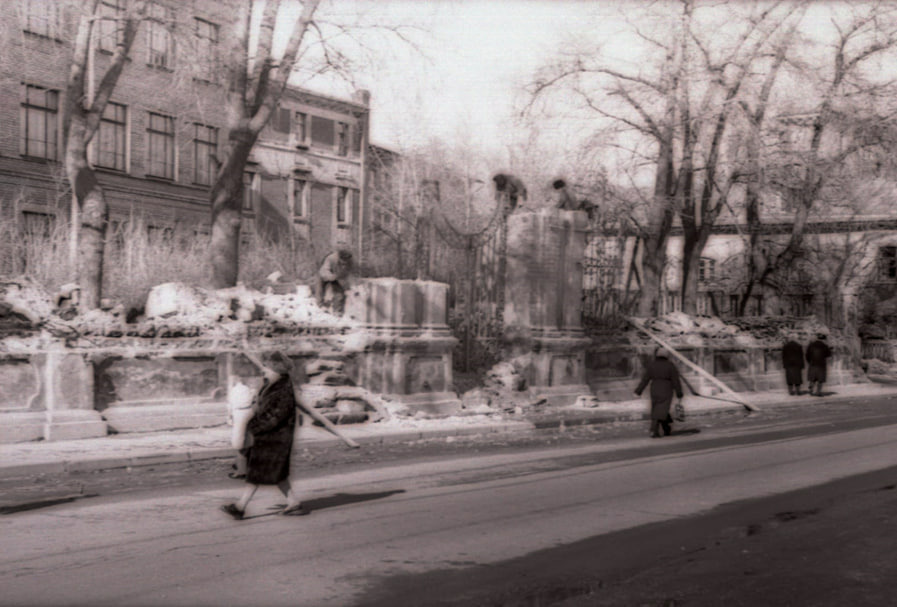 Илл. 9. Разрушение барочных столбов и арки XVIII века ограды храма Спаса Преображения на Б. Спасской улице. Фотограф: С.В. Шавурин, 1966 год.