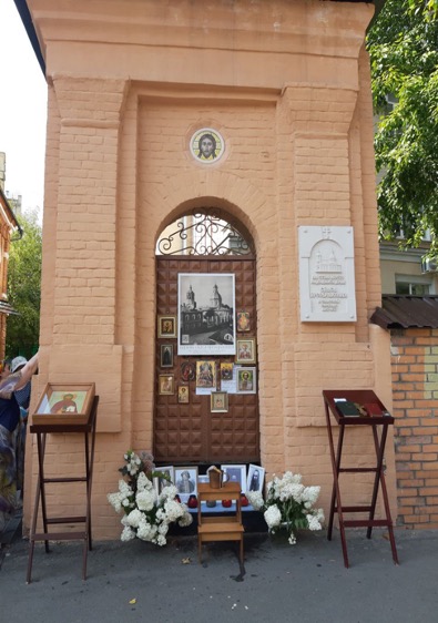 Перед каждым молебном прихожане с любовью украшают «Спасскую арку» — сохранившийся арочный фрагмент от ограды Спасского храма. Жительница Спасской слободы Ольга Георгиевна Петькина каждый молебен тщательно составляет импровизированный «иконостас», располагая на арке иконы. (Илл. 23).
