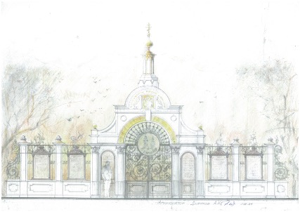 Разработан на основе проекта ворот ограды погоста храма Спаса Преображения. Архитектора С.А. Гамбурцева, 1891 г. (из архивов по истории храма).