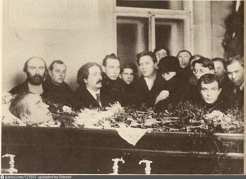 Прощание в Москве. В центре мать и сестра Катя. У головы З. Райх и Вс. Мейерхольд