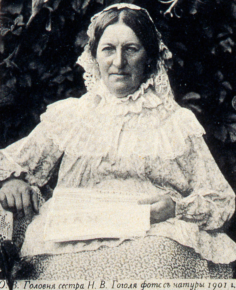 В завещании своем Гоголь советовал сестрам открыть в деревне приют для бедных девиц, а по возможности и превратить его в монастырь. Одна из сестер могла бы стать игуменьей. Имел в виду, конечно, младшую сестру Ольгу Васильевну. О замужестве Ольга Васильевна не думала. «Кто же возьмет меня, старую, глухую, калеку, и к тому же бедную и некрасивую», – с улыбкой говорила она, когда с ней заговаривали об этом[11]. Перед Крымской войной к ней посватался немолодой офицер Яков Иванович Головня. Мать, Мария Ивановна, наотрез отказала ему. После войны он вновь приехал в Васильевку. «Ольге Васильевне сделалось очень жаль этого израненного человека, – сообщает сын, – и она, не задумываясь, приняла теперь его предложение. Пошли дети, разрослось домашнее хозяйство. Но вскоре муж умер, оставив ей трех малолетних детей (У них были дети: Мария, Николай и Василий), которых надо было вырастить и воспитать. Дети выросли. Но тут новое горе. Самоубийство старшего сына 25-летнего Николая. Затем умерла от родов ее 27-летняя дочь (оставив трех маленьких детей, которых привезли к ней в Васильевку). До самой смерти лечила больных. Умерла в 82-летнем возрасте»[12].