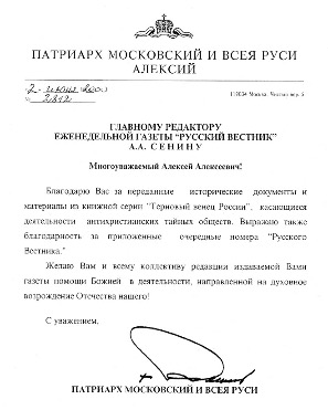 Зато православным людям мои книги очень понравились. Многим они открыли глаза на суть происходящего в нашей стране. Все свои главные книги я отправлял для информации руководителям нашей страны и, конечно, патриарху, которым тогда был Алексий II. Со стороны правительственных структур в ответ на мои книги было зловещее молчание. Зато со стороны Патриарха Алексия II пришло благожелательное письмо. Святейший благодарил нас за присланные книги. Хотя сделал это дипломатично – через газету «Русский Вестник». Посылать благодарность прямо на мое имя патриарх не решился.