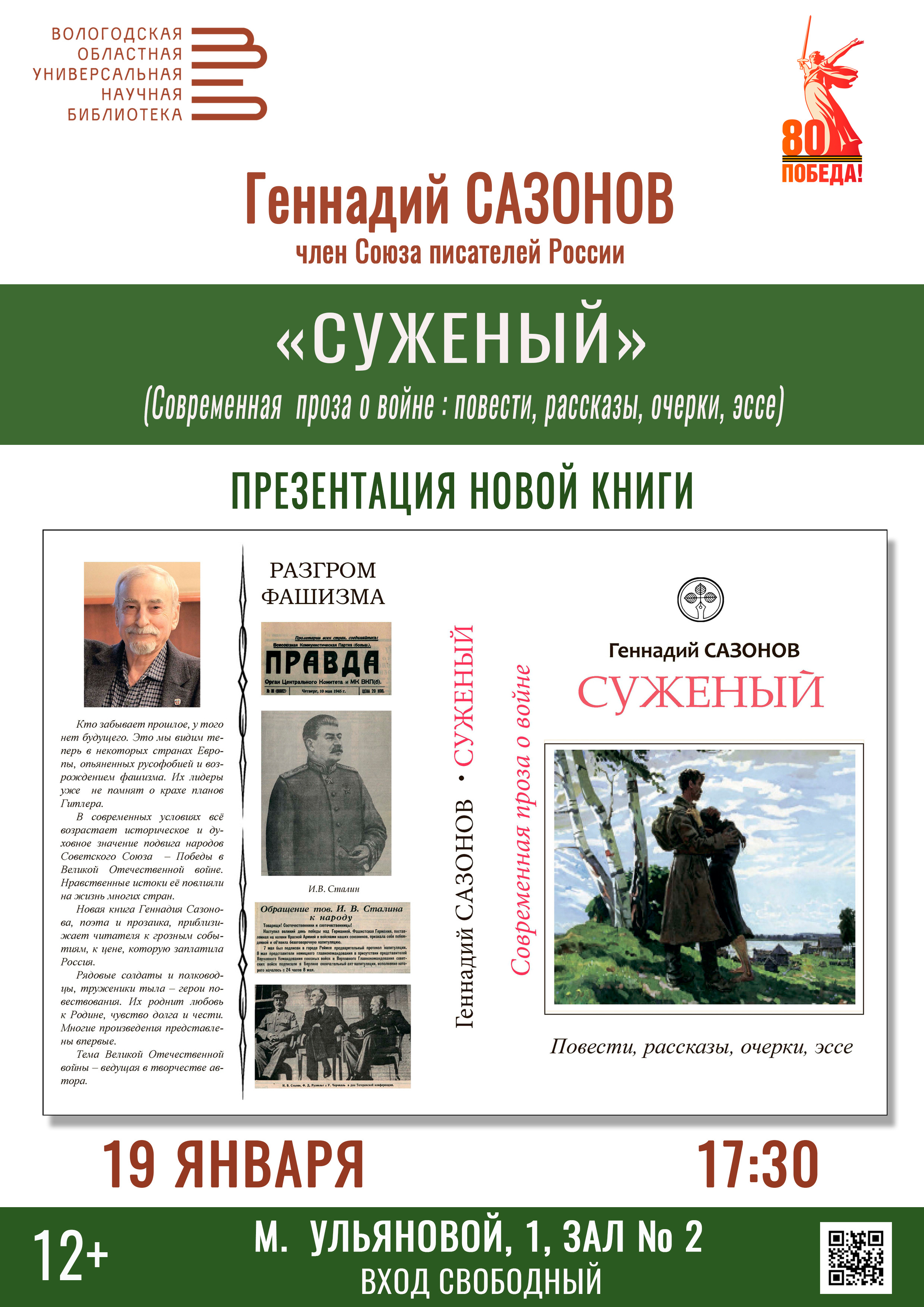 На днях в Вологодской Областной научной библиотеке состоялась первая презентация книги «СУЖЕНЫЙ» поэта, прозаика и публициста писателя Геннадия САЗОНОВА. В книгу современной прозы вошли повести, рассказы, очерки, эссе, она посвящена 80-летию Победы в Великой Отечественной войне. Ряд произведений ранее были опубликованы на сайте «РУССКАЯ НАРОДНАЯ ЛИНИЯ и в журнале «БЕРЕГА». Презентация новой книги также прошла в селе ОГАРКОВО Вологоского района.