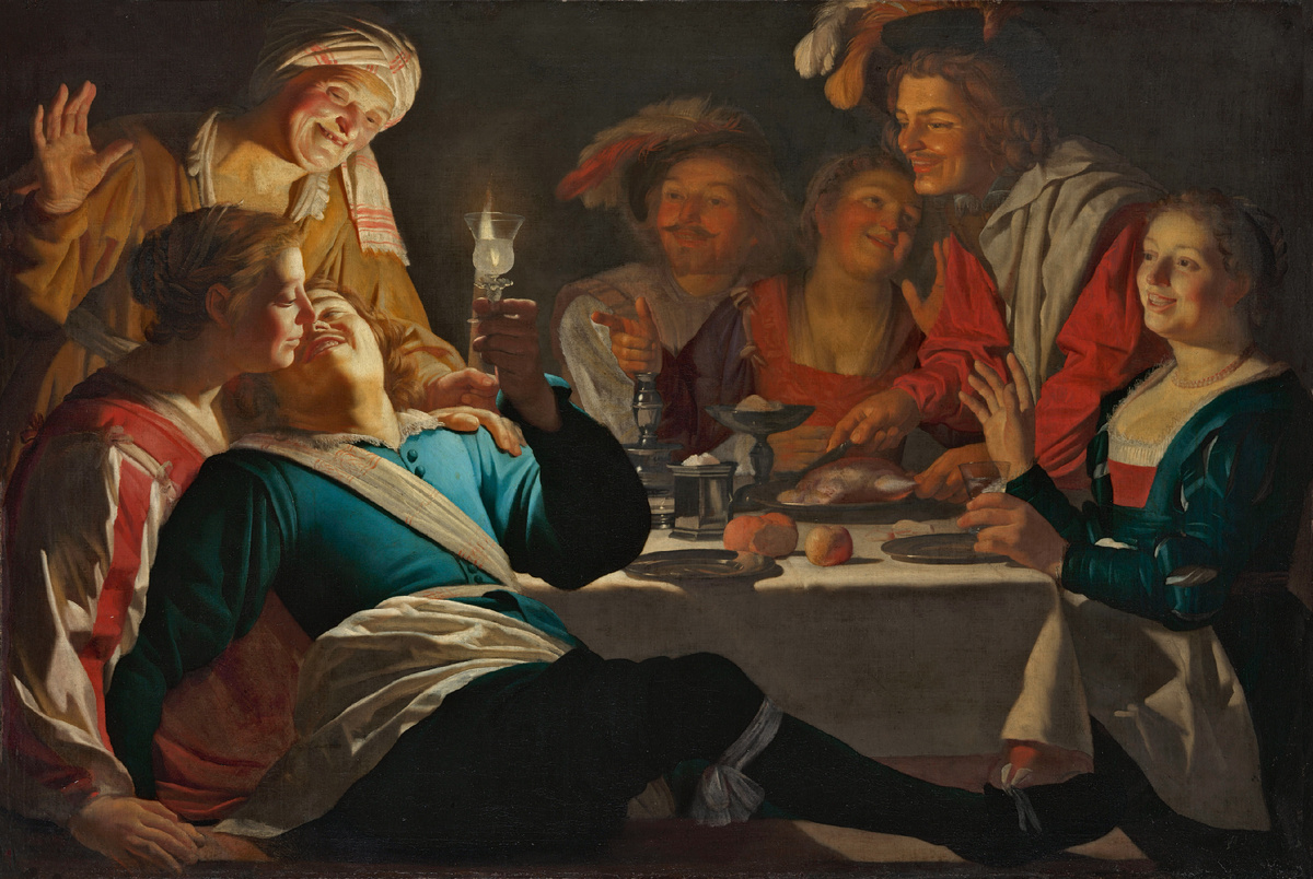 Геррит ван Хонтхорст. «Веселая компания», 1622 год. Старая пинакотека, Мюнхен. В описи 1716 года картина названа «Блудный сын, соблазнённый выпивкой и ласками в борделе»