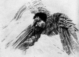 Романтическая традиция родила трагический образ падшего ангела с крыльями, сохранившими светлый лебяжий цвет, но с чёрную душою, гнездящуюся в могучем торсе. Он напоминает человека, но не человек. Он так же совершил непоправимый грех и был изгнан из рая. Но его Бог не прощает, как прощает мелких греховодников — земных человецев. Они ему сочувствуют, они его боятся, они завидуют его силе и дерзости...