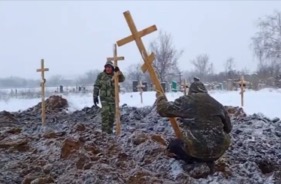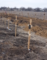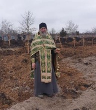 Так за разговором мы подъехали к большому пустырю на окраине города, здесь за околицей небольшого селения у края сельского кладбища были вырыты стройные ряды свежих могил, над могильными холмиками уже высились новенькие, крытые лаком деревянные кресты с надписями. Один, два, сорок, сто двадцать, сто девяносто ... Я сбился со счета. «Бессмертный полк» новой гражданской войны, подумалось мне. Даниилу никак не удавалось найти батюшку, который бы согласился в прифронтовой зоне совершить отпевание гражданских лиц, а тут явился целый собор фронтовых священников: отец Евгений из «БАРСа», отец Ростислав из гуманитарной миссии «Ветеран-доброволец» и я.