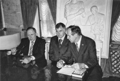 На представлении книги «Почему погибнет Америка». Справа от меня Ю. Граф и Х. Райзеггер. 2005 год