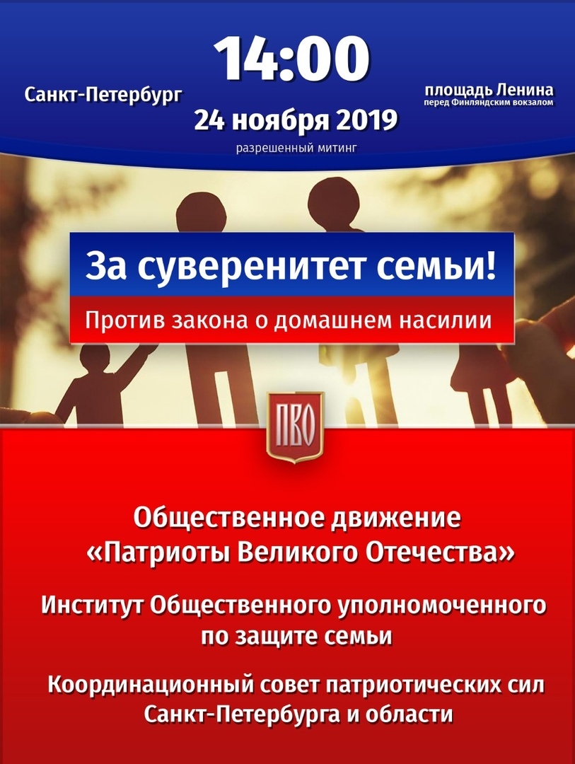 В воскресенье, 24 ноября, в Санкт-Петербурге в 14.00 состоится санкционированный митинг «За суверенитет семьи! Против закона о домашнем насилии!», сообщили «Русской народной линии» устроители мероприятия.