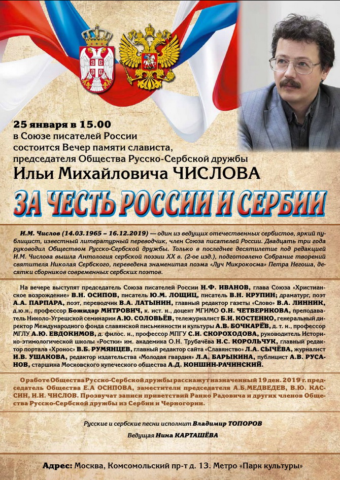В Москве 25 января в 15.00 в Союзе писателей России состоится вечер памяти слависта, председателя Общества Русско-Сербской дружбы Ильи Михайловича Числова, сообщили РНЛ организаторы.