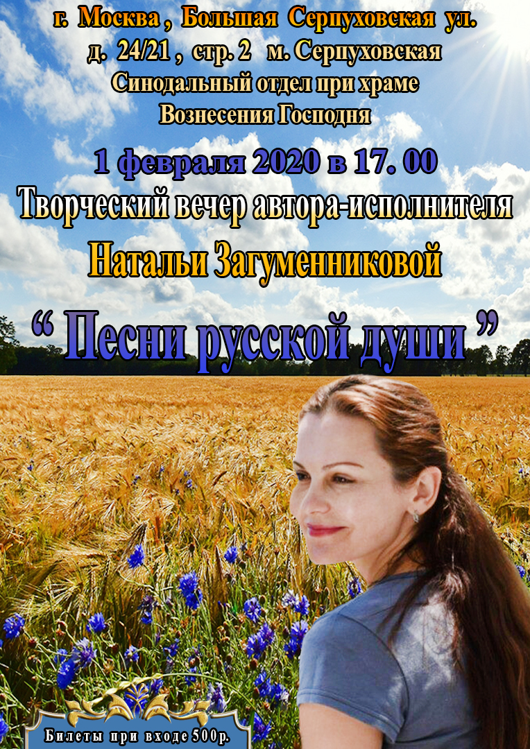 «Дорогие друзья! Приглашаем Вас на творческий вечер автора-исполнителя Натальи Загуменниковой "Песни русской души"! Вам подарят радость и душевную теплоту авторские стихи и лирические песни в сольном и дуэтном исполнении, песни под гитару и музыкальные композиции в других стилях. Также в концерте примут участие соавторы и творческие друзья Натальи: группа "Колокольня Калязина", Александр Таль, Дмитрий Чернов, Сергей Рассказов и др. поэты и авторы-исполнители», - говорится в пресс-релизе, поступившем в редакцию РНЛ.