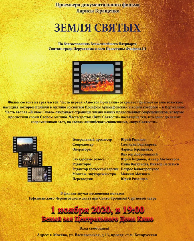 1 ноября в 19.00 в Белом зале Центрального дома кино (Москва, ул. Васильевская, д. 13, проезд до станции метро «Белорусская») состоится показ фильма о Православии в Великобритании «Земля святых», говорится в пресс-релизе, поступившем в редакцию РНЛ.
