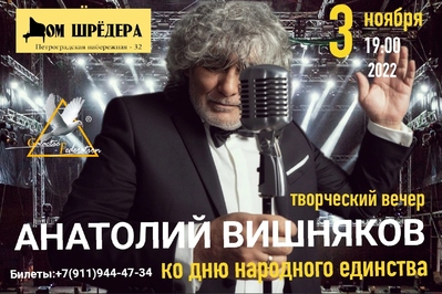 Концерт Анатолия Вишнякова состоится 3 ноября, 19.00. Дом Шрёдера, г. Санкт-Петербург, Петроградская наб., 32, м. «Горьковская».
